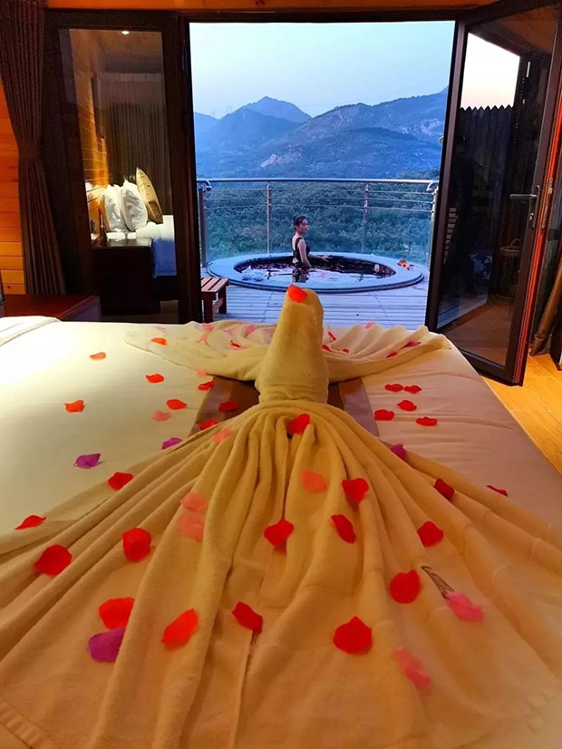 房间面积27-33㎡,配备1.8米*2米大床一张,并配有贵妃椅和床榻。站在窗子前,看向室外,群山环绕,水雾弥漫,汤泉美景一览无遗。